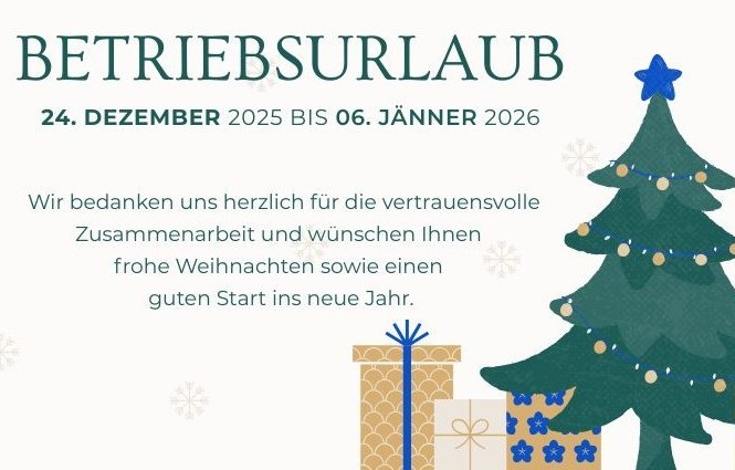 Wir sind vom 24. Dezember 2025 bis einschließlich 6. Januar 2026 im Betriebsurlaub und in dieser Zeit nicht erreichbar.